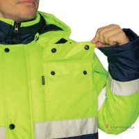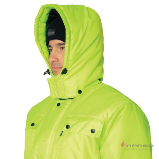 Капюшон: утепленный, съёмный на кнопках. Лицевой выреза капюшона регулируется с помощью шнура. По объёму регулируется в области затылочной части с помощью хлястиков на полукольцах. Подбородочная часть застегивается на контактную ленту.