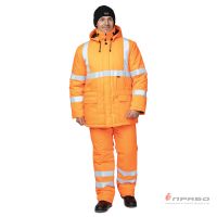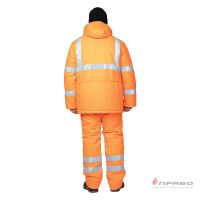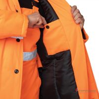 Куртка: удлинённая прямого силуэта с притачной утеплённой подкладкой, с центральной потайной застёжкой на пуговицы, с уловителями для пуговиц. Наличие внутренней ветрозащитной планки, удобный отложной воротник, преобразующийся в воротник–стойку при помощи функционального хлястика, делают костюм комфортным решением с максимальной защитой для работы в сложных погодных условиях при плохой видимости. Рукава двухшовные, с внутренними трикотажными манжетами. Куртка регулируется по объёму кулиской с фиксаторами и наконечниками.