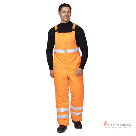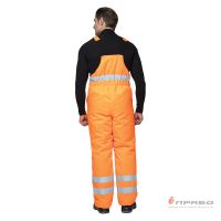Полукомбинезон: с притачной утеплённой подкладкой, застёгивается на двухзамковую молнию, закрытую планкой. Бретели со стороны спинки частично с открытой эластичной лентой, застёгиваются спереди на фастекс. Регулировка объёма по линии талии с помощью кулиски с эластичной лентой. Светоотражающие полосы шириной 50 мм.