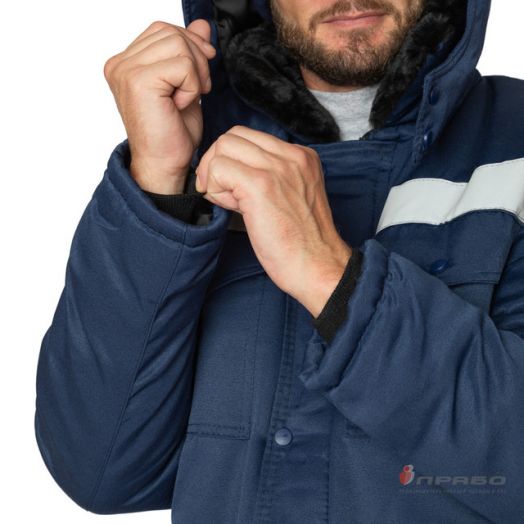 Куртка: прямого силуэта, с меховым воротником, с центральной застёжкой на молнию и ветрозащитной планкой на кнопках. Рукава с внутренними трикотажными манжетами. По линии талии куртка регулируется по объёму благодаря кулиске. Капюшон: утеплённый, съёмный. Подбородочная часть капюшона широкая, застёгивается на две кнопки.