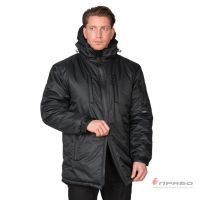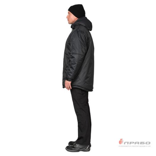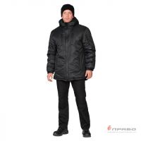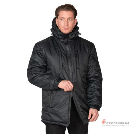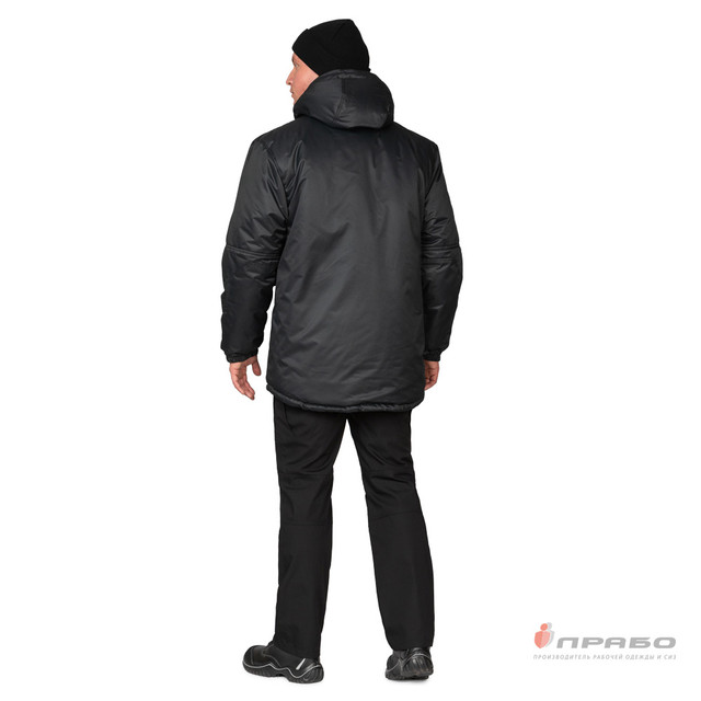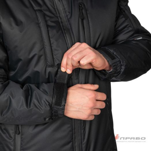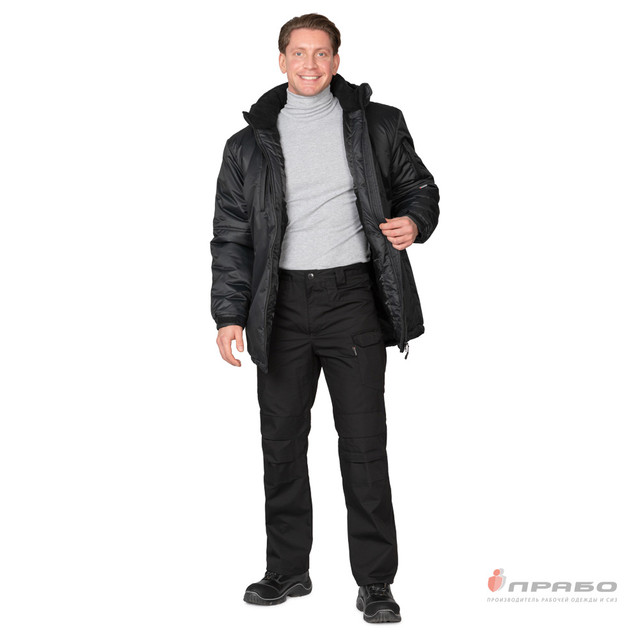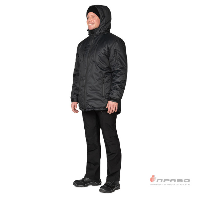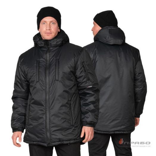 Куртка: прямого силуэта с притачной теплозащитной простёганной вертикальными строчками подкладкой, с центральной застёжкой на двухзамковую влагозащитную молнию с внутренней утеплённой ветрозащитной планкой. Верхняя часть молнии закрывается мягкой планкой из основной ткани, которая защищает подбородок от защемления и не доставляет дискомфорт при носке. Воротник-стойка утеплённый, внутренний воротник из флиса. На верхнюю часть воротника настрочены клапаны с кнопками для пристёгивания концов капюшона, это даёт возможность фиксации воротника в вертикальном положении с помощью его удлиненных краёв на кнопки без одновременного застёгивания нижней части капюшона. Рукава одношовные, низ рукава с притачной манжетой, манжета частично с эластичной тесьмой, объём дополнительно регулируется при помощи паты с застёжкой на контактную ленту. Низ куртки регулируется по объёму при помощи шнура и фиксаторов в боковых швах. Капюшон: утеплённый, съёмный, пристёгивается к горловине на молнию, закрытую планкой. На капюшоне предусмотрена возможность регулировки объёма по лицевому вырезу, обеспечивая защиту от попадания снега, дождя и ветра внутрь капюшона. Глубина регулируется на затылочной части с помощью хлястика на контактной ленте. На подбородных частях капюшона кнопки для крепления к воротнику. Подкладка капюшона из флиса.