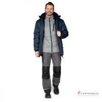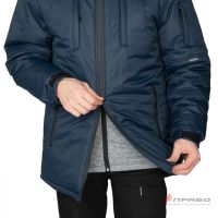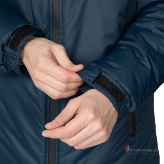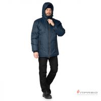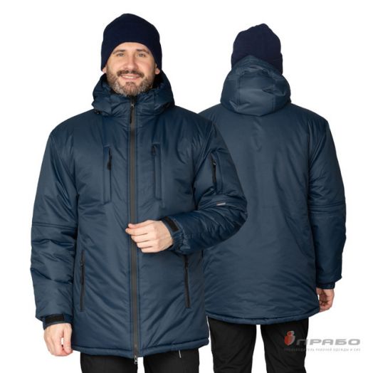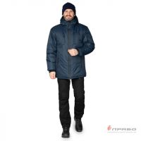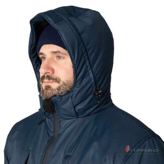 Куртка: прямого силуэта с притачной теплозащитной простёганной вертикальными строчками подкладкой, с центральной застёжкой на двухзамковую влагозащитную молнию с внутренней утеплённой ветрозащитной планкой. Верхняя часть молнии закрывается мягкой планкой из основной ткани, которая защищает подбородок от защемления и не доставляет дискомфорт при носке. Воротник-стойка утеплённый, внутренний воротник из флиса. На верхнюю часть воротника настрочены клапаны с кнопками для пристёгивания концов капюшона, это даёт возможность фиксации воротника в вертикальном положении с помощью его удлиненных краёв на кнопки без одновременного застёгивания нижней части капюшона. Рукава одношовные, низ рукава с притачной манжетой, манжета частично с эластичной тесьмой, объём дополнительно регулируется при помощи паты с застёжкой на контактную ленту. Низ куртки регулируется по объёму при помощи шнура и фиксаторов в боковых швах. Капюшон: утеплённый, съёмный, пристёгивается к горловине на молнию, закрытую планкой. На капюшоне предусмотрена возможность регулировки объёма по лицевому вырезу, обеспечивая защиту от попадания снега, дождя и ветра внутрь капюшона. Глубина регулируется на затылочной части с помощью хлястика на контактной ленте. На подбородных частях капюшона кнопки для крепления к воротнику. Подкладка капюшона из флиса.