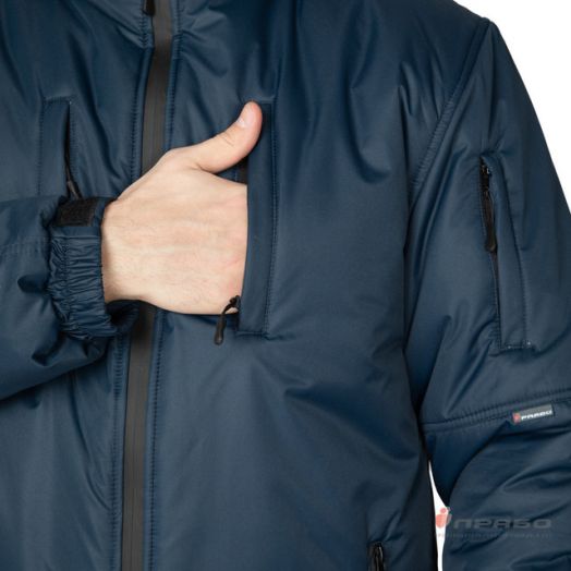 Карманы: верхние нагрудные прорезные вертикальные карманы с листочкой, с застёжкой на молнию; нижние прорезные карманы с застёжкой на специальную влагозащитную молнию; в верхней части рукава прорезной карман с листочкой, с застёжкой на молнию; внутренние накладные карманы увеличенного размера из сетки, с левой стороны внутри накладного кармана из сетки расположен накладной карман из основной ткани с застёжкой на молнию.